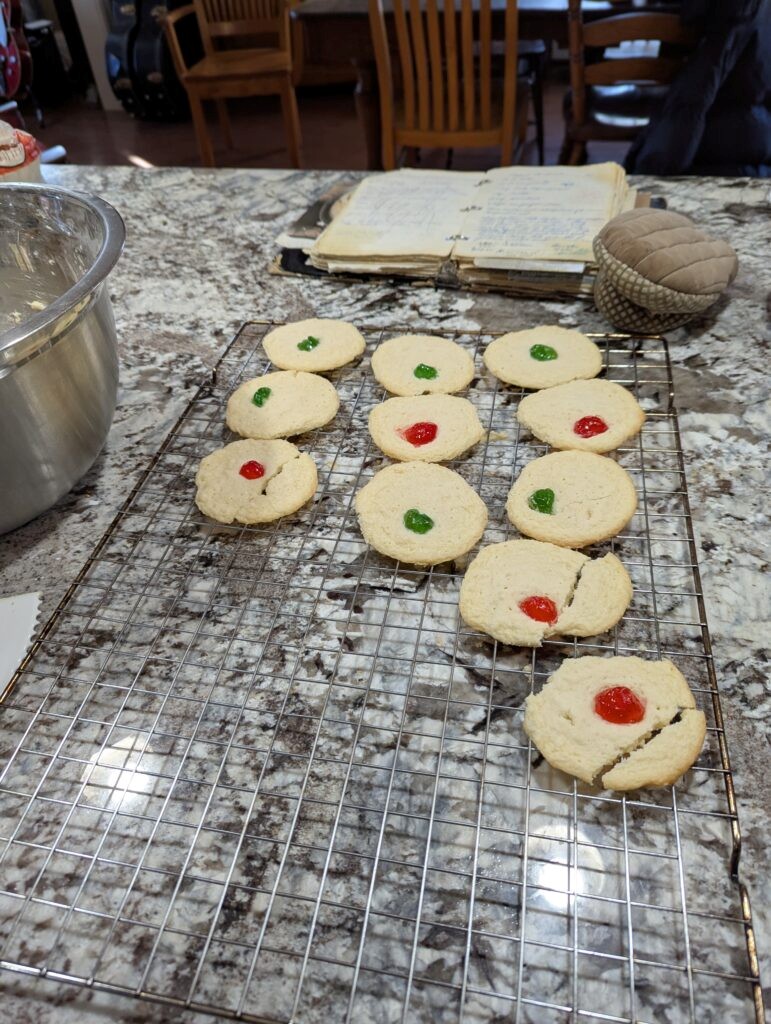 I am sure Bubba would be giving a little shake of her head and reminding me to stick to the recipe. I thought I was being smart and used Cake and Pastry flour. Turns out that Cake and Pastry flour does not have enough gluten in it to hold the shape of the cookie. So as the cookies went into the oven, I was excited because they looked just like Bubba’s, but when I opened the door after 12 minutes I said, “That does not look like Bubba’s cookie.” They had spread and were very fragile. Tasted okay, but not the cookie I remember. For the second attempt I used All Purpose flour and it was a success.